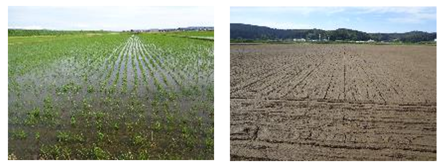 写真右:「コシヒカリ」を6/5に播種、落水管理中。写真では見えづらいが出芽苗列が確認でき出芽は順調。