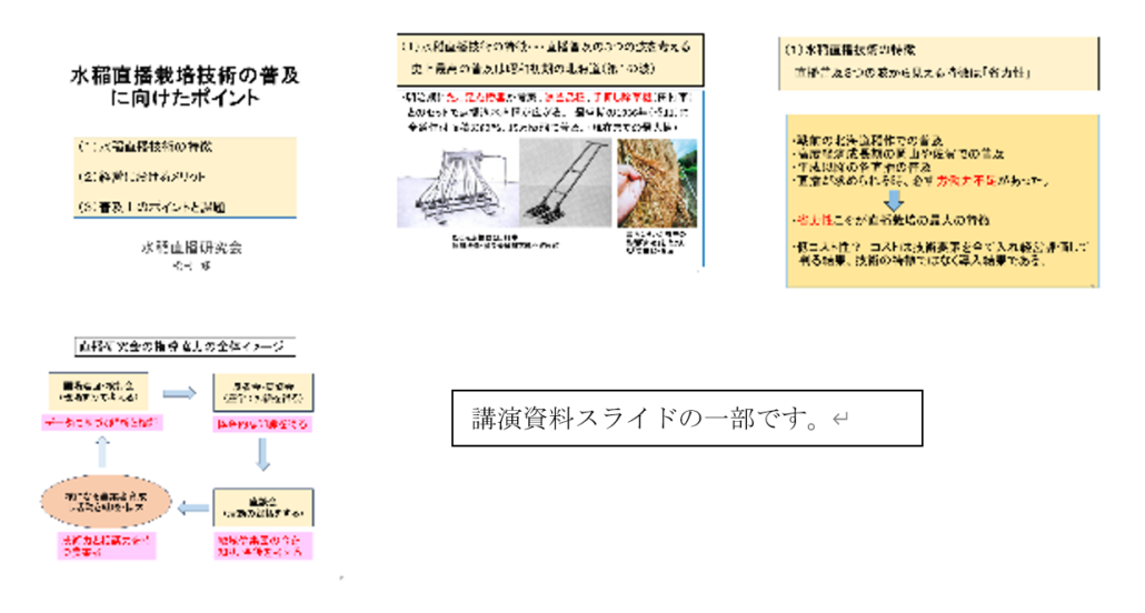 会長・松村から「水稲直播栽培技術の普及に向けたポイント」のタイトルで、「1.水稲直播栽培技術の特徴、2.経営におけるメリット、3.普及上のポイントと課題」の3つで構成される話をしました。