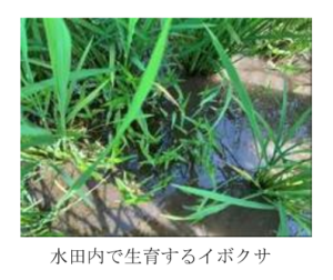 「ひとめぼれ」を5月7日に土壌中点播。中干しを終えて幼穂形成期に入っており、茎数は十分確保されていました。オモダカと後発のヒエ、茎長10~20cmに生育したイボクサが散見されましたが、以前は多かったと記憶するイヌホタルイはほとんど発生していませんでした。