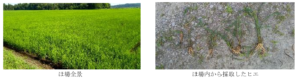 WCS栽培時に多少の雑草取りこぼしは大目に見て除草剤1剤のみの使用としていたためか、ほ場の雑草種子量がおそらく多く、また均平も不十分なため、初期剤のヒエに対する効果が不足したと説明がありました。最近の「米不足」事情の中での急な作付け変更の影響と思いました。取りこぼしの高葉齢ヒエが目立ったため、追加でヒエ対象の茎葉処理剤を散布したそうですが、たしかにダメージを受けたヒエが見受けられました。